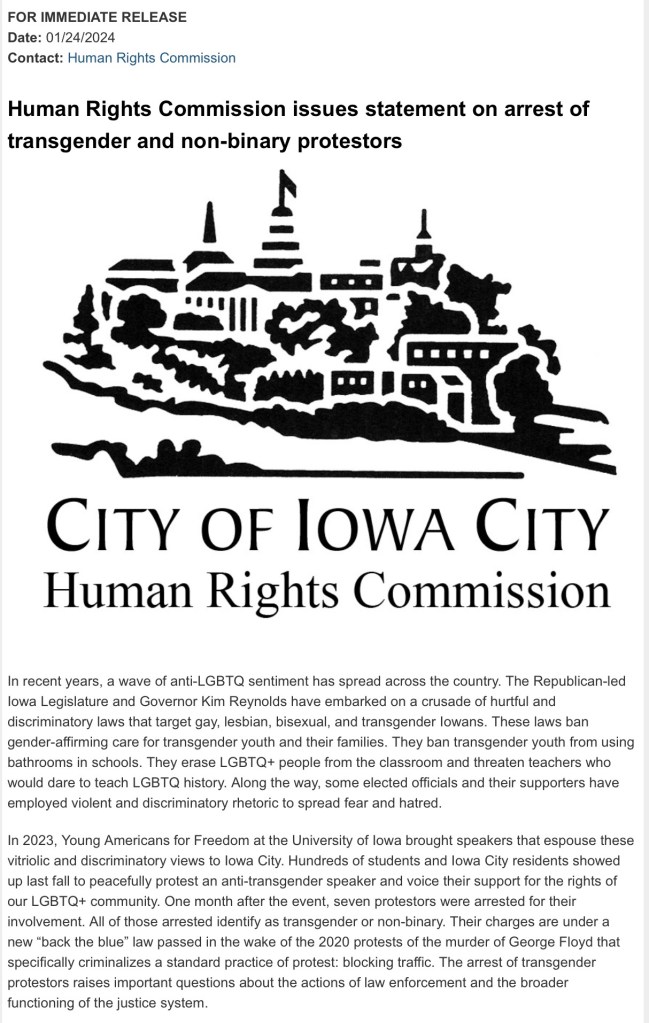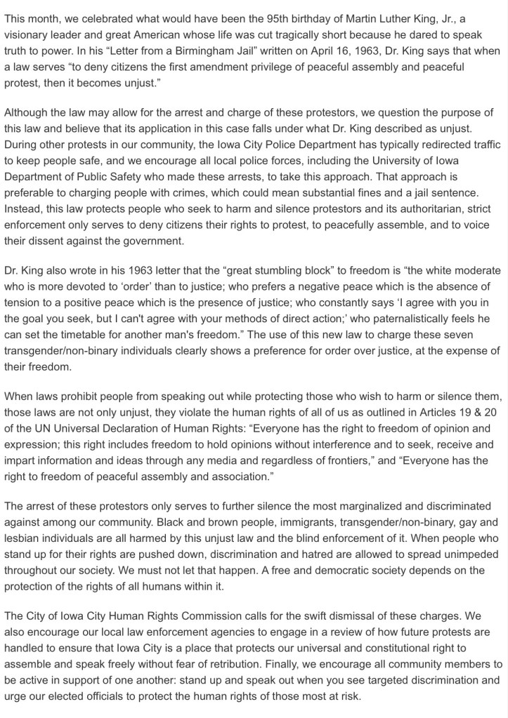 The City of Iowa City Human Rights Commission calls for the swift dismissal of these charges. We also encourage our local law enforcement agencies to engage in a review of how future protests are handled to ensure that Iowa City is a place that protects our universal and constitutional right to assemble and speak freely without fear of retribution. Finally, we encourage all community members to be active in support of one another: stand up and speak out when you see targeted discrimination and urge our elected officials to protect the human rights of those most at risk.