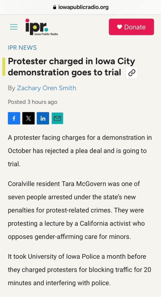 Coralville resident Tara McGovern was one of seven people arrested under the state’s new penalties for protest-related crimes. They were protesting a lecture by a California activist who opposes gender-affirming care for minors.