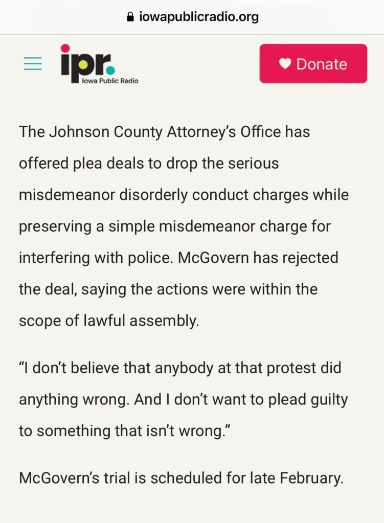 The Johnson County Attorney’s Office has offered plea deals to drop the serious misdemeanor disorderly conduct charges while preserving a simple misdemeanor charge for interfering with police. McGovern has rejected the deal, saying the actions were within the scope of lawful assembly.