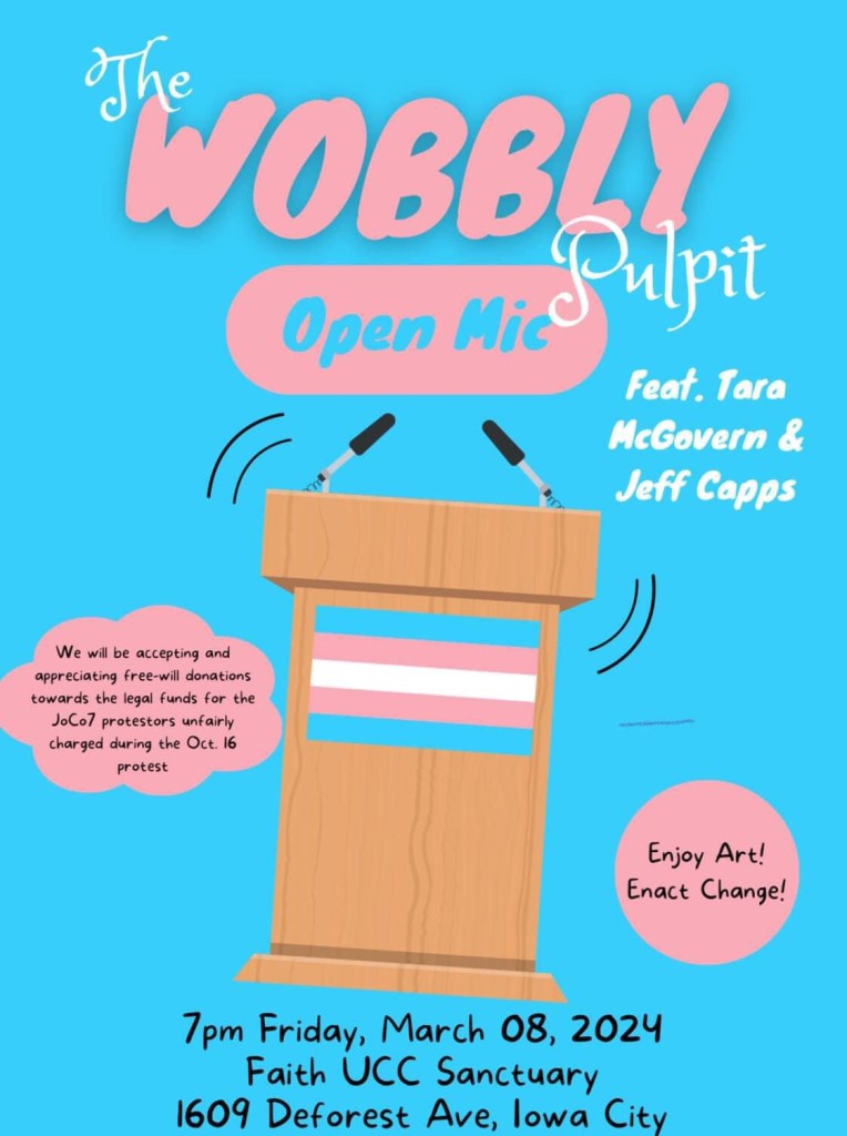 Join us on Friday, March 8 at 7 pm for The Wobbly Pulpit at Faith UCC in Iowa City, a community concert to benefit the JoCo7.