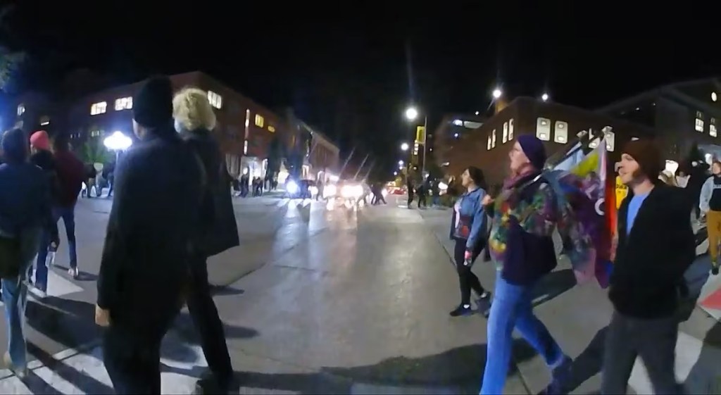Police body-camera footage shows Tara McGovern carrying rainbow and trans rights flags during at protest on Oct. 16 at the University of Iowa in Iowa City. (University of Iowa Police Department)