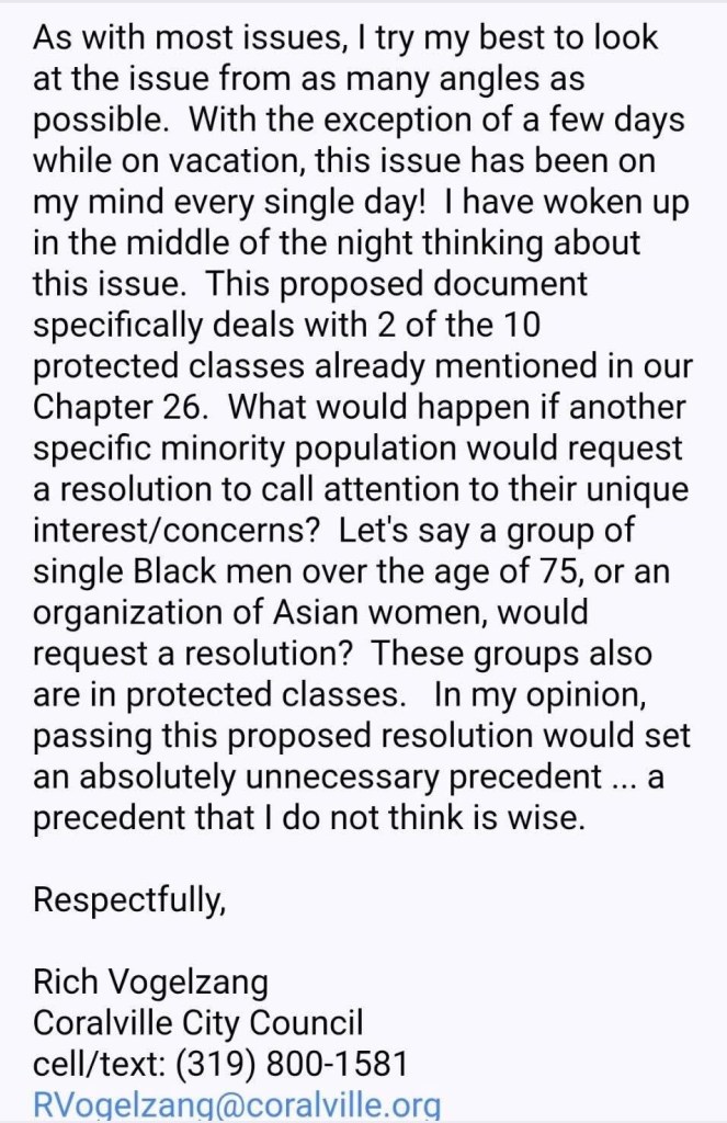 Coralville Councilor Vogelzang says that “to pass this document just seems like an appeasement to the LGBTQ community” and that “passing this proposed resolution would set an absolutely unnecessary precedent that I do not think is wise.”.